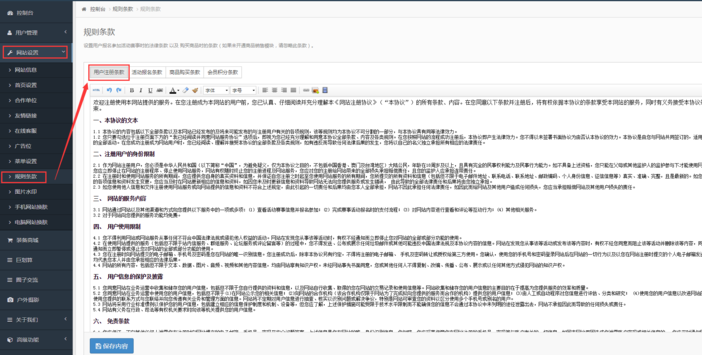 5. 系统后台的规则条款里增加【用户注册条款】的自助修改