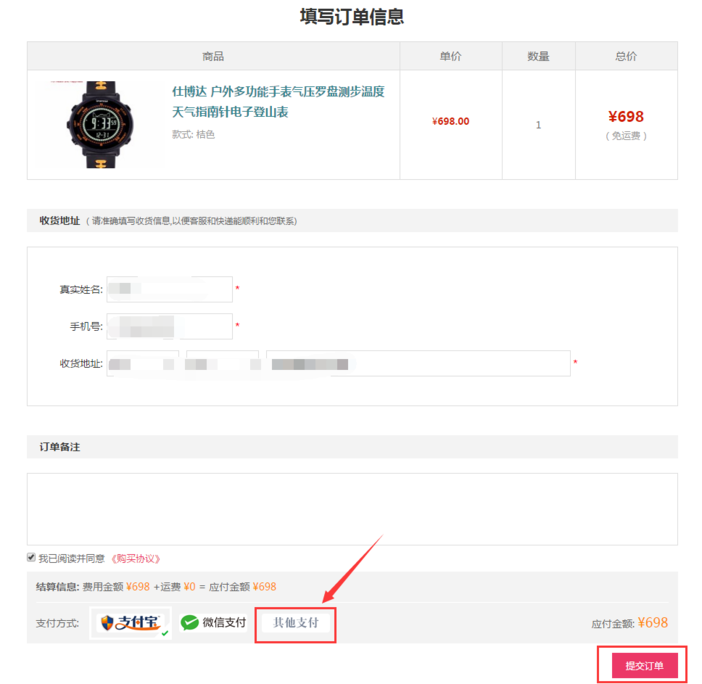除了常用的支付宝和微信支付以外,商品和活动报名提交订单时又增加了【其他支付】方式。