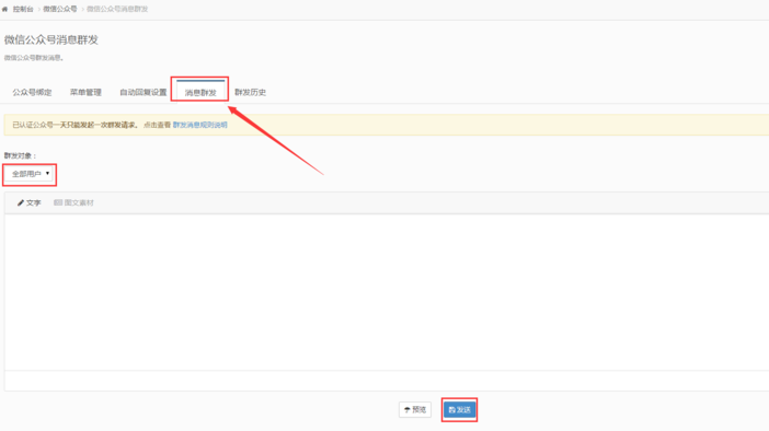 增加微信公众号绑定功能后小伙伴们的反响还不错,现在这个功能又得到了优化,增加了消息群发功能,选择好群发对象,就可以直接进行消息群发了呢,是不是很方便?